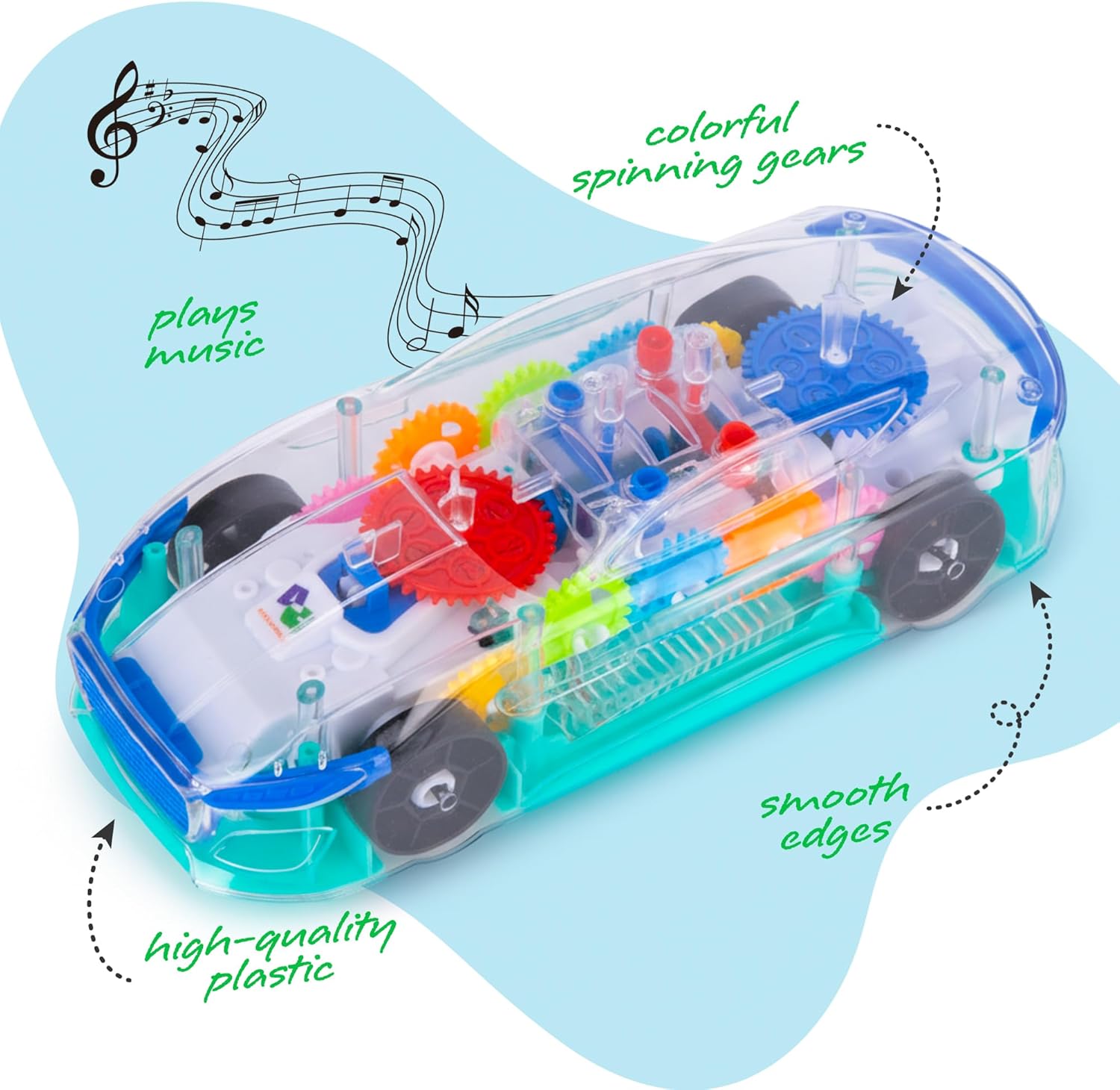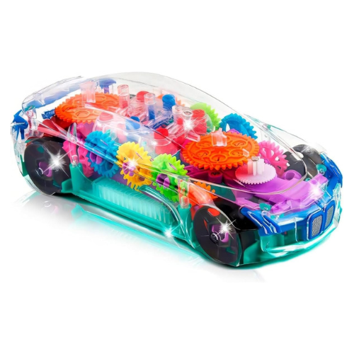 - FUEL THE EXCITEMENT: A car toy that takes fun to fast and furious extremes! This transparent toy car for kids is crammed with features.It lights up, it plays music, it moves on its own, and it even has colorful gears that turn in spectacular style for hours of fun.
