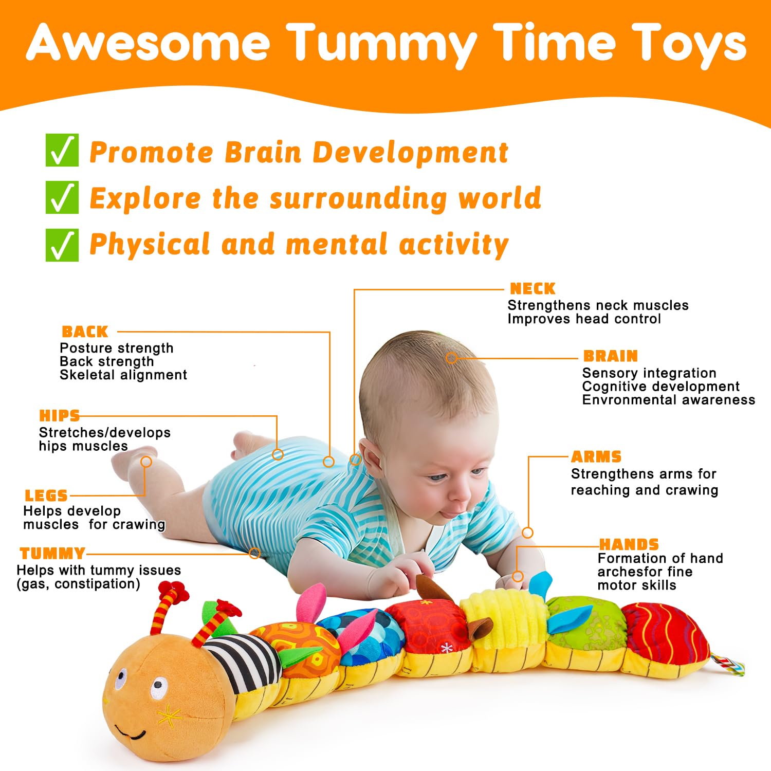 - Perfect Tummy Time Toys: Our caterpillar plush toy is also a brilliant tummy time toy. Our infants 0-6 months toys can exercise baby’s neck and back muscles and prevent your baby’s head from being flat. It’s good for baby practicing hand eye coordination and grabbing things. The most important is that our baby crinkle toy has measurement so you can mark the length of your lovely baby every day. It’s perfect tummy time toys and Montessori toys for babies 6-12 months. Best baby toys 4-6 months.