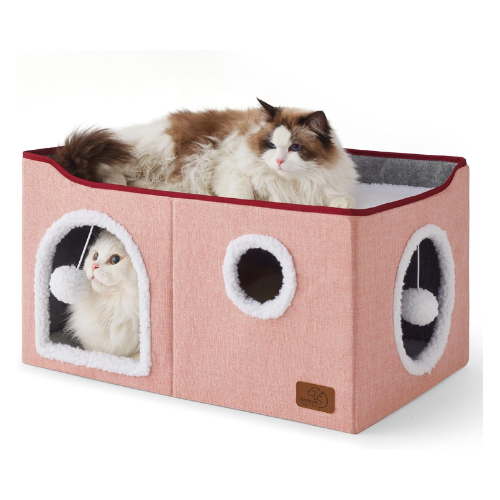 Bedsure Large Cat Beds for Indoor Cats – Extra Wide Cat Cube House for Small Pet with Fluffy Ball Hanging and Scratch Pad, Foldable Pet Cave Hideaway for Multiple Cats, 23.6×16.9×13 inches,Pink