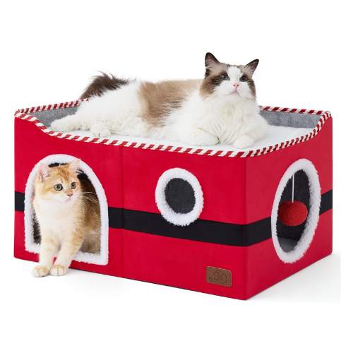 Bedsure Large Cat Beds for Indoor Cats – Extra Wide Cat Cube House for Small Pet with Fluffy Ball Hanging and Scratch Pad, Foldable Pet Cave Hideaway for Multiple Cats, 23.6×16.9×13 inches,Red