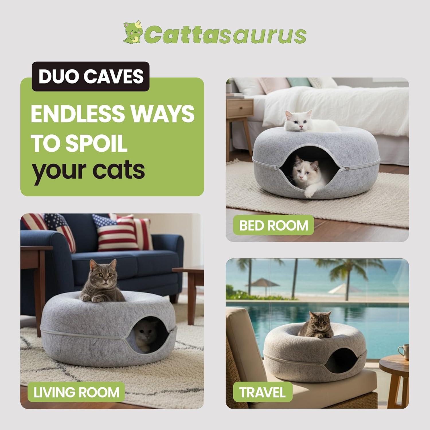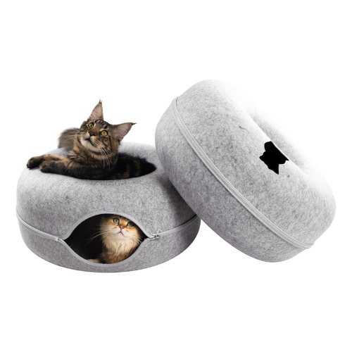 Cattasaurus Peekaboo Cat Cave Donut for Multiple & Large Cats up to 30-45 lbs, 3-in-1 Self Warming Cat Bed, Tunnel & Scratcher for Indoor Cats, Washable & Detachable (Light Gray + Light Gray, Large)