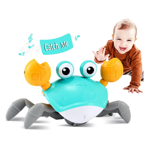 - Crawling Crab Baby Toy: It moving fast, skitters sideways like a real crab, and plays fun sounds and music and lights up. It has sensors that reverse its direction when it nears an obstacle. If you have any questions about whether the product and product size meets your requirements, please feel free to contact our customer service at any time.