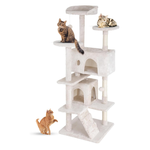 FDW | 54″ Cat Tree Tower | Beige | Multi-Level Indoor Activity Center with Sisal Scratching Posts, Condos, Plush Perches, Hanging Cat Toys | Sturdy, Easy to Assemble | for Kittens & Adult Cats