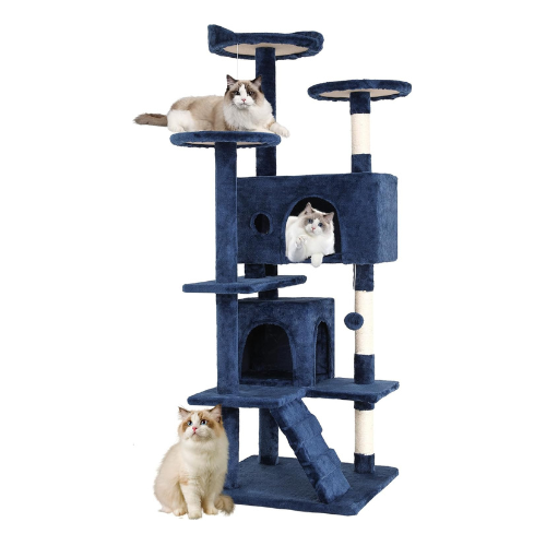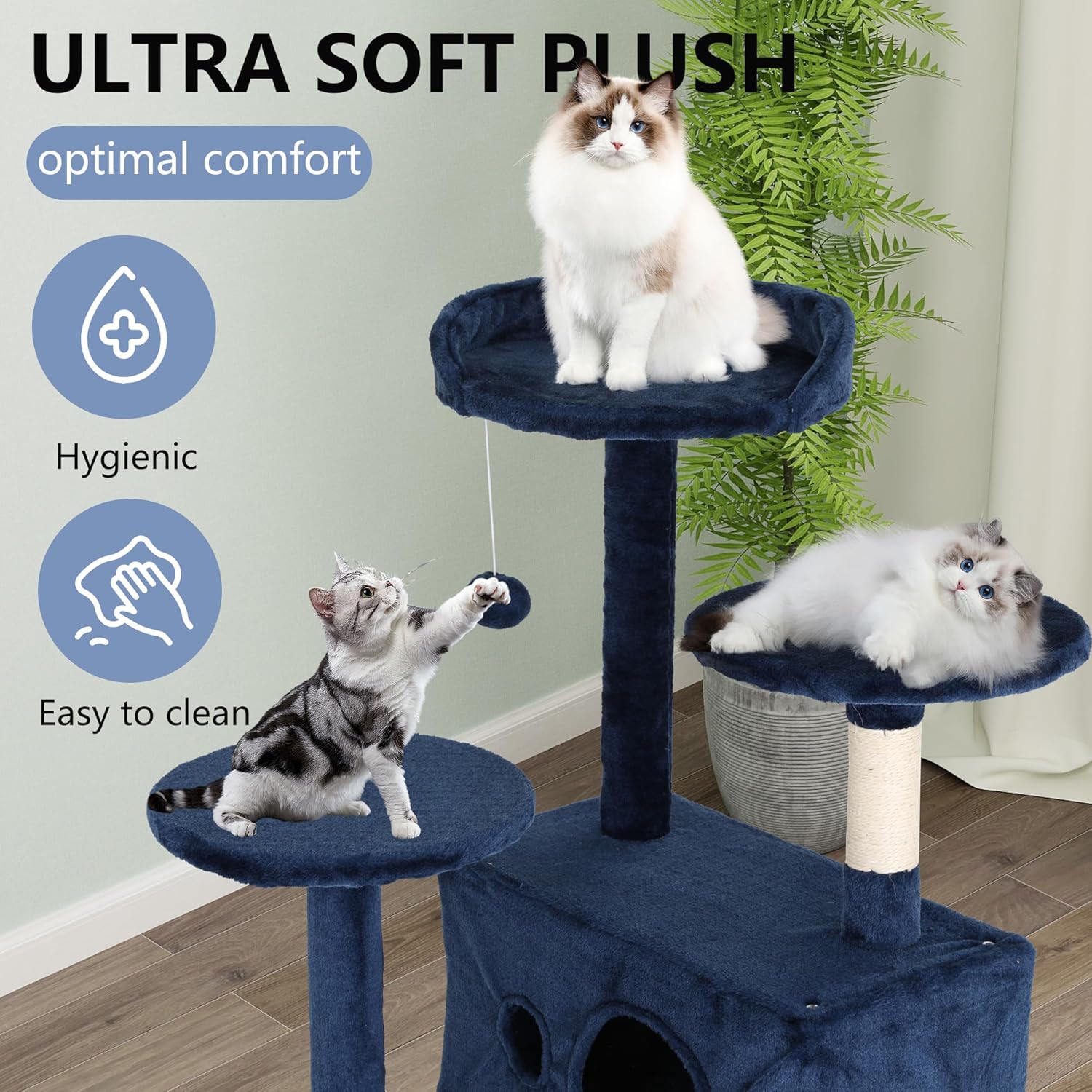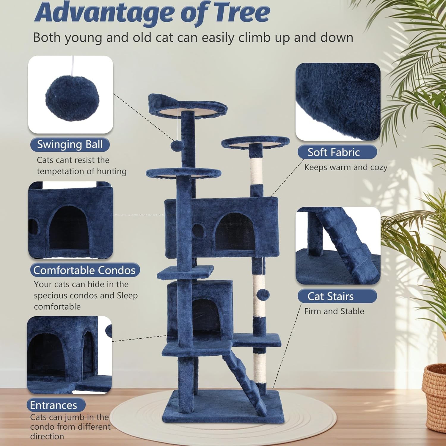 FDW | 54″ Cat Tree Tower | Dark Blue | Multi-Level Indoor Activity Center with Sisal Scratching Posts, Condos, Plush Perches, Hanging Cat Toys | Sturdy, Easy to Assemble | for Kittens & Adult Cats