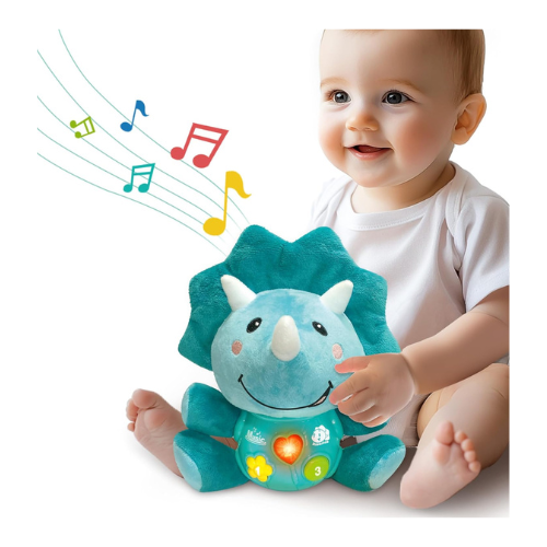 - 【Stuffed Dinosaur Toy】Features 3 buttons for nature sounds of birds and other animals, 12 classic nursery rhymes, and 6 different sound effects (SFXs). When shaken, the Triceratops also emits soft light, baby cooing sounds, and laughing sounds.
