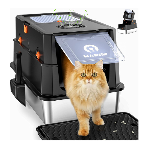 Stainless Steel Litter Box with Lid, Anti-Leakage Enclosed Metal Litter Box, Flip-Top Extra Large Kitty Litter Pan with Scoop & Pedal, Odor Free, Front & Top Dual Entry, Black