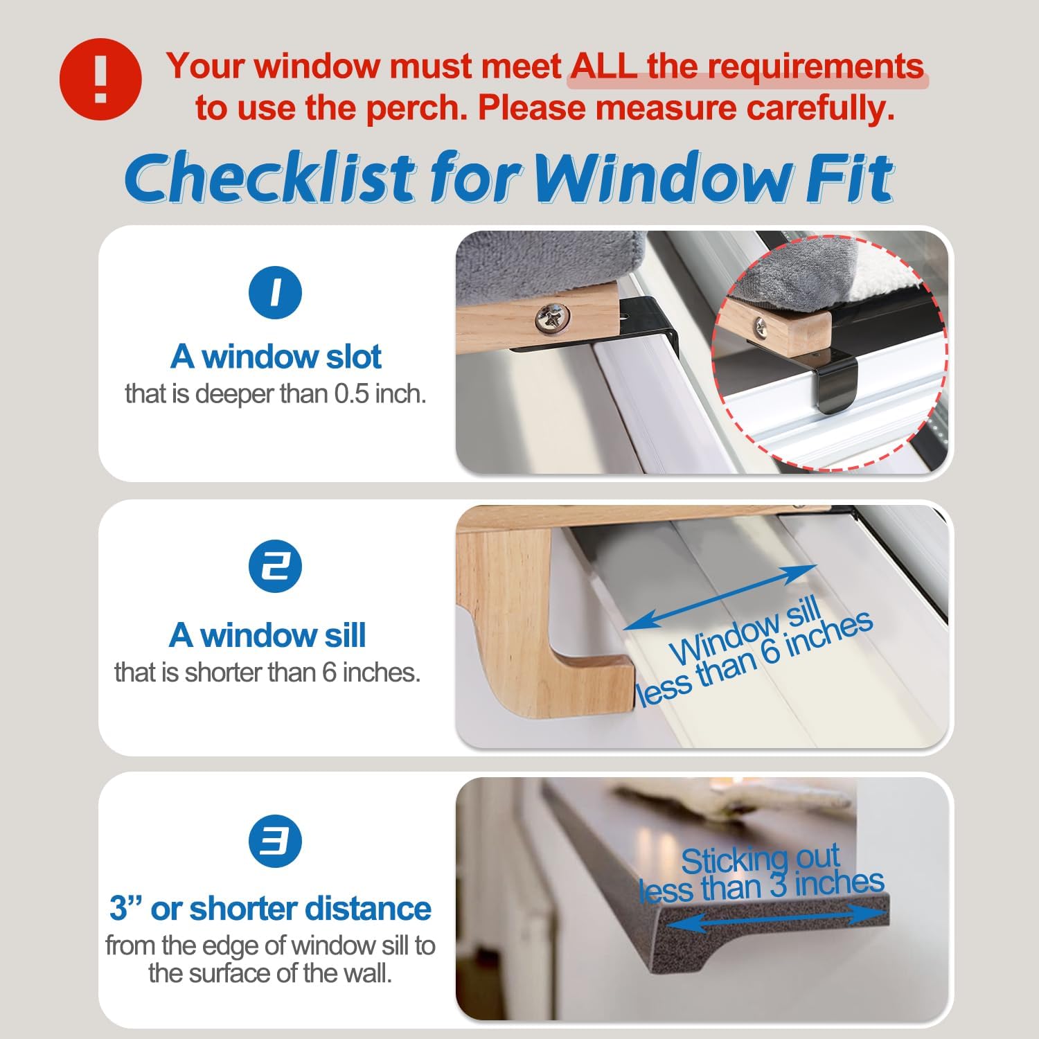 - No Suction Cups or Drilling Needed】 Ensure your window has a SLOT at least 0.5 inches deep for the perch to hook onto (hook thickness: 0.08 inch). The bracket is widely adjustable to fit various setups, with a maximum window sill depth of 9 inches. The perch can be moved from window to window by simply lifting it up.